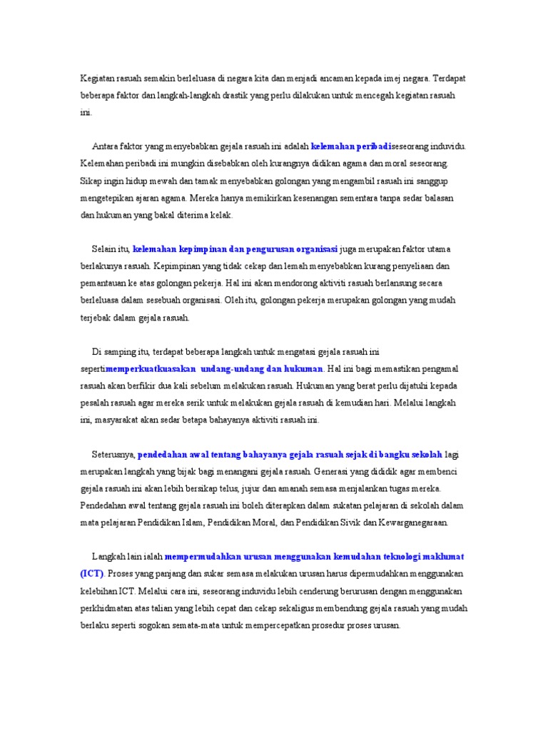 Namun demikian gejala rasuah di negara kita masih tidak dapat diatasi. Perbuatan jenayah terkutuk ini bukan sahaja bahaya untuk masyarakat malah merupakan masalah besar bagi menjamin kelestarian keadilan dan kemajuan sesebuah negara. Up to 24 cash back Contoh Karangan A SPM DAN PT3.